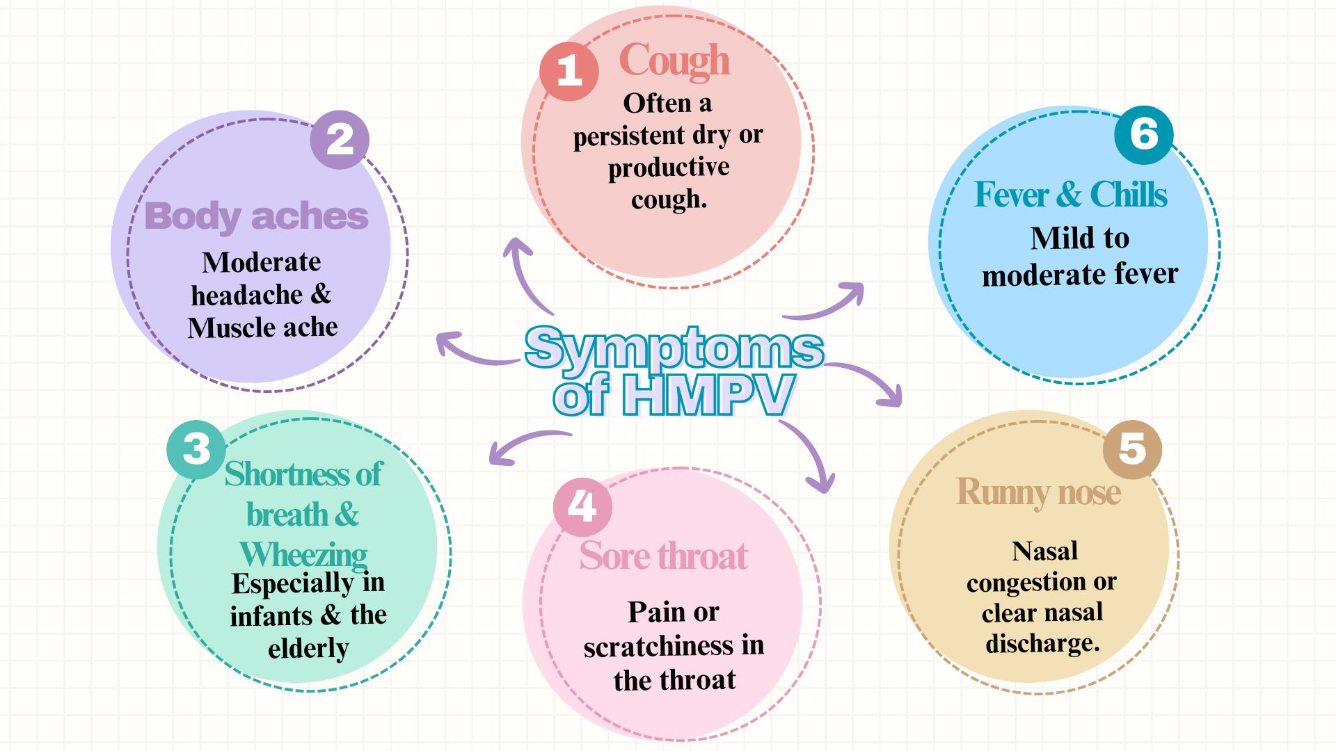 HMPV symptoms are comparable to those of other flu-like infections, such as coughing, fever, and a stuffy or runny nose. HMPV typically causes symptoms comparable to the common cold, which last around 2-5 days and resolve on their own.