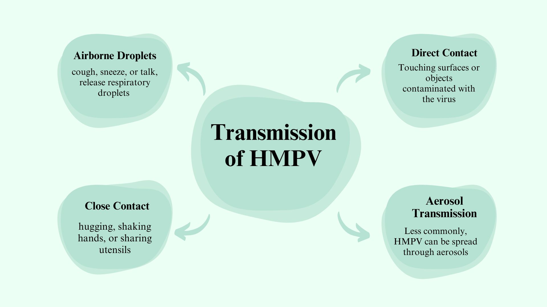 HMPV spreads through close contact with an infected person or contaminated surfaces. It typically transmits via droplets from coughing and sneezing, as well as through personal contact like hugging or shaking hands, followed by touching the mouth, nose, or eyes.