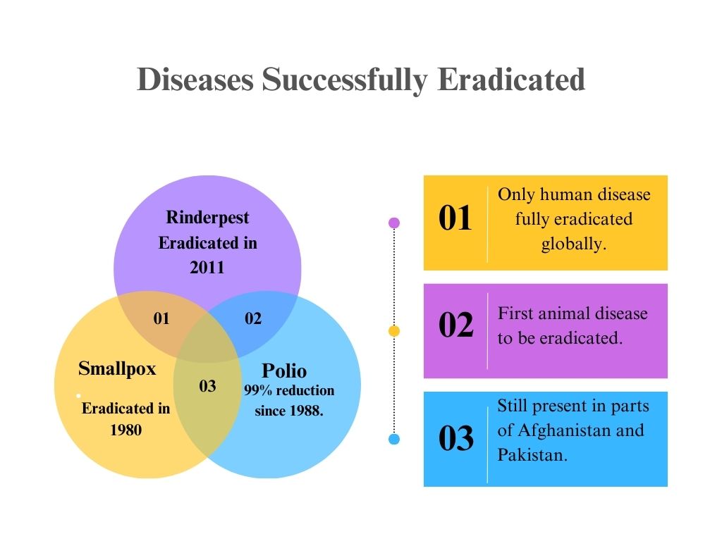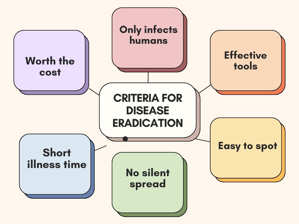 The science, the political environment, and the economic aspects of a disease must all be considered in order to determine whether it can be eradicated. By focusing on scientific standards, academics and public health specialists can evaluate smallpox and rinderpest eradication efforts. Certain traits that were present in both of these illnesses helped to eradicate them.