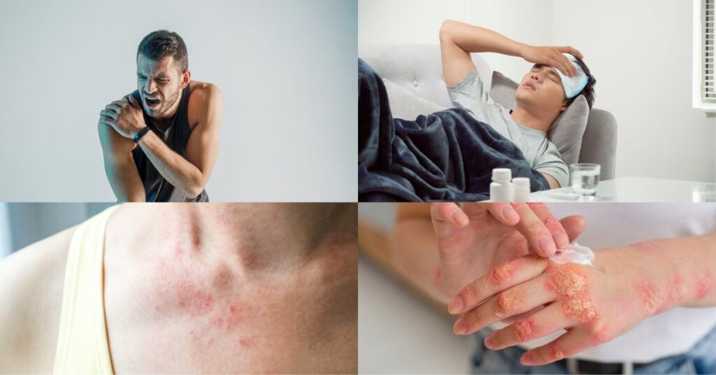 The condition begins with a fever prodrome lasting 1-4 days, followed by headaches, muscle aches, and backache, as well as weariness, sweating, fatigue, and a cutaneal appearance. Skin rashes begin within 1-3 days of fever onset. The rash may develop on the face, inside the lips, hands, feet, chest, genitals, anus, or in the eyes. Lesions begin as a flat rash (macula) and then rise from the skin (papules), eventually taking on a “vesicle” appearance by filling with clear liquid. The clear liquid inside the vesicles turns yellowish, forming “pustules”. Pustules, crusts, and lesions diminish when the crusts fall. After the crust has fallen off, patients are termed noninfectious.